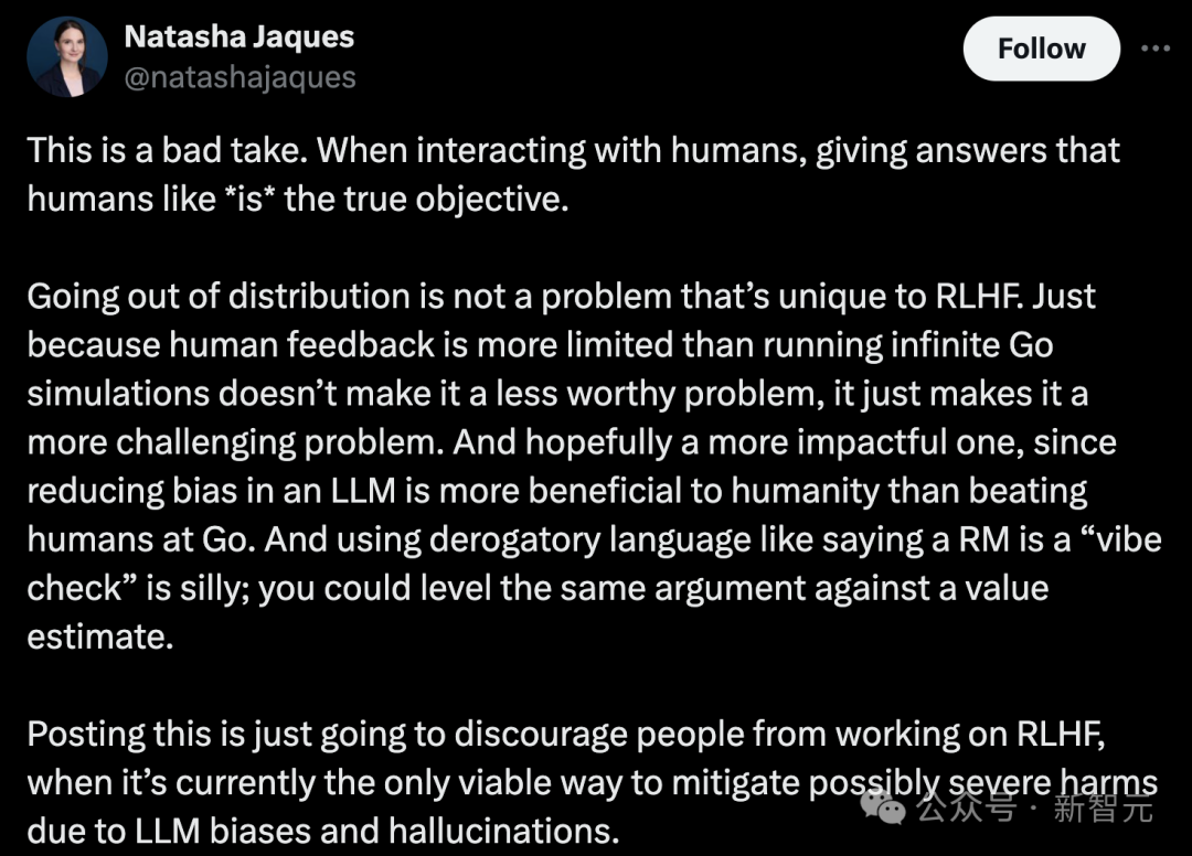 华盛顿大学助理教授、谷歌AI高级研究科学家Natasha Jaques的反对态度更鲜明,力挺RLHF方法: