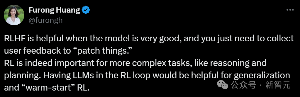 马里兰大学副教授Furong Huang的观点更强调RLHF对LLM的价值。