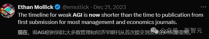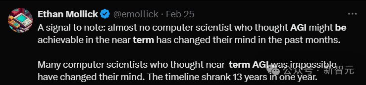 今年早些时候,Ethan Mollick发推特称,「许多计算机科学家曾认为近期 AGI是不可能的,但他们已经改变了主意。时间线在一年内缩短了13年。」