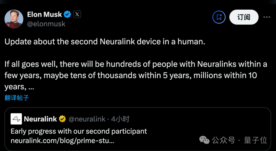如果一切顺利,几年内将有数百人使用Neuralink,5年内可能有数万人,10年内将有数百万人……