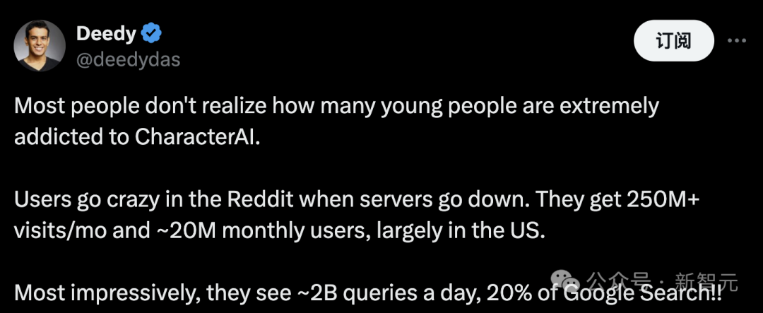 Shazeer成为Gemini联合技术负责人之一,意味着什么?此前,曾有消息曝出马斯克有意这笔收购,甚至还有传言Meta也想入局。可见,Character.AI如此受宠,说明其背后的技术实力,不容小觑。在谷歌任职期间,创始人Noam Shazeer联手Daniel de Freitas便领导了Lamda团队,专注于开发对话语言程序。然而,这个项目并未真正发出来,因为谷歌对其说错话产生后果,担惊受怕。甚至,在2022年,谷歌工程师Blake Lemoine闹了一场乌龙被开除。因为他告诉华盛顿邮报,相信Lamda是有知觉的。一年前,他们共同创办了Character.AI,开发中用到了类似Lamda技术。他们提供了一个网站,人们可以在这里与任何人聊天,无论是活着的还是去世的,是真实的还是想象的。许多人,尤其是年轻人们,纷纷爱上了与各种虚拟角色聊天的过程。一位VC曾发文,许多人没有意识到,有多少美国年轻人极度沉迷于CharacterAI。仅每月访问量超过2.5亿次,每月用户约2000万。最令人印象深刻的是,每天就会约有2B次查询,占谷歌搜索的20%!经过两年多的发展,Character.AI已经积累了2000+万用户。凭借靓丽的创始人背景,以及AI爆款产品,Character.AI曾在23年3月,由a16z领投融资1.5亿美元,估值10亿美金。除了创办出实力独角兽,Noam Shazeer另一重身份,便是Transformer创世之作的核心作者。曾经八大金刚,全部离开谷歌。现在又有Shazeer重返。