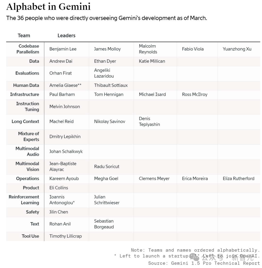 报道中,一张图表呈现了4月份,谷歌Gemini团队的核心人员,大概有36人。他们分散在数据、评估、基础设施、指令微调、上下文、MoE、多模态语音等不同组中。今年2月,第四位Gemini首席开发者Ioannis Antonoglou,在伦敦创办了一家AI初创。后面有两个*,是离职加入OpenAI的人,比如Amelia Glaese(在谷歌任职6年+)。此外,Gemini团队负责人Jeff Dean,就不用多介绍了。另外一个负责人Oriol Vinyals,曾是DeepMind深度学习团队负责人,带队AlphaStar击败专业玩家,在谷歌已任职有十年。和经常有华人面孔的OpenAI团队不同,从名单来看,Gemini团队的核心成员似乎只有3名华人。Andrew Dai本科毕业于剑桥大学计算机科学专业,博士毕业于爱丁堡大学。博士期间就曾在谷歌进行过两段软件工程实习,2012年博士毕业后入职谷歌,目前担任首席研究科学家/主任,在Gemini研发中负责领导数据组。Yuanzhong Xu本科毕业于本科毕业于上海交通大学信息工程专业,2016年从德克萨斯大学奥斯汀分校毕业后曾在Facebook工作8个月,之后在2017年以软件工程师职位加入谷歌。2022年,Xu转任DeepMind高级软件工程师,目前已经做到首席工程师的职位,在Gemini研发中负责代码库并行工作。Jilin Chen2006年从北京大学毕业,获得信息与计算科学专业的学士和硕士学位,之后前往明尼苏达大学攻读博士,曾在微软亚洲研究院、Palo Alto研究中心、IBM研究院工作,并于2014年加入谷歌担任软件工程师。