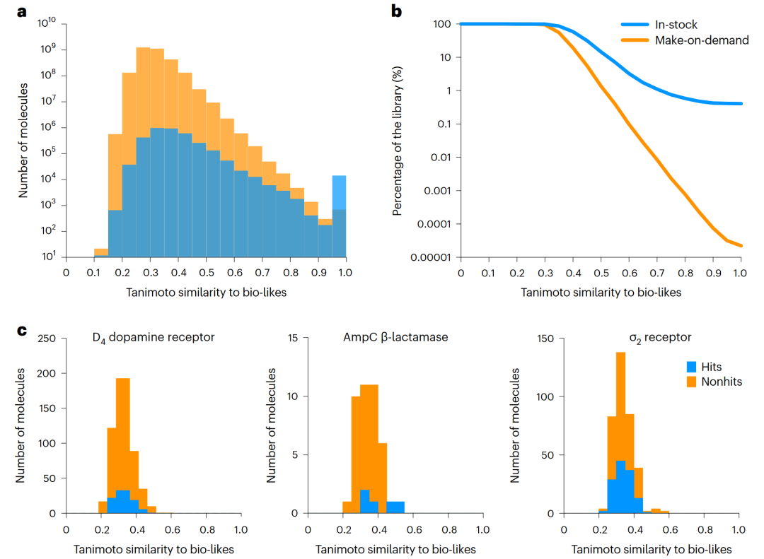 对高通量筛选(HTS)平台和“库存”库的一个有趣观察是,与随机预期相比,它们与生物类似分子(代谢物、天然产物和药物)的相似性高出1000倍以上。为了研究这种与生物类似分子的相似性如何随库大小变化,作者将350万库存库和310亿按需制备库与世界各地的药物、代谢物和天然产物(“生物类似”分子)进行了比较。使用ECFP4拓扑指纹,作者计算了每个库分子与每个生物类似分子之间的Tanimoto相似性。在此比较中,Tanimoto系数(Tc)代表两个分子(库和生物类似分子)之间共享的特征数除以特征总数。Tc为1表示两者相同,而0.2的得分则表示相似性低到基本上没有意义。如之前所见,库存集与生物类似分子的相似性远超预期(图1a,蓝色曲线),其中有10,000个库存分子与代谢物、天然产物或药物相同(图1b)。相反,当库从350万库存分子增长到30亿个实体分子(增长886倍)时,尽管库的大小增大了三个数量级,但与生物类似分子的Tc值>0.8的分子数量实际上减少了2.3倍(图1a,橙色曲线)。与生物类似分子相比,实体库的大部分增长都来自于随机相似性区域,该区域的峰值约为 0.25Tc;在这一区域,实体库比库存库增长了3000倍。在随机相似性和完全同一性的两个极端之间,30亿实体库与生物类似分子的相似性下降速度(图1a,橙色曲线)远快于350万库存库(图1a,蓝色曲线)。当与生物类似分子的基本完全同一性(0.95 < Tc ≤ 1.0)达到时,只有0.000022%(700个分子)的按需制备库符合条件,而“库存”分子中有0.42%符合条件,减少了19,000倍。因此,尽管使用新的超大库进行的对接活动已返回具有高命中率的高效分子,但这些新库并未保留库存库和高通量筛选库所特有的对生物类似分子的强烈偏好。