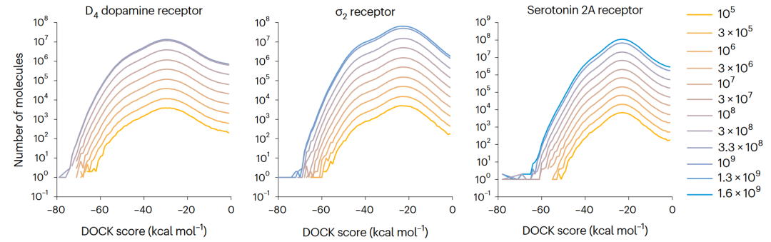 作者将越来越大的库与、和5HT2A受体进行对接,以研究对接分数如何随库大小而变化。作者首先分别将3.44亿、14亿和17亿个分子与这三个受体进行对接;然后,从这一最大集合中随机挑选出越来越大的库子集30次,子集大小从增加到超过个分子,增量为半对数。对于每个子集,测量了排名前5000的分子的分数和支架(分为四个等级)以及分数优于某一阈值的分子数量。