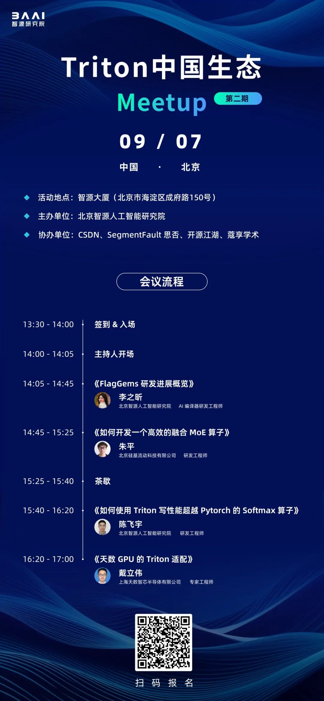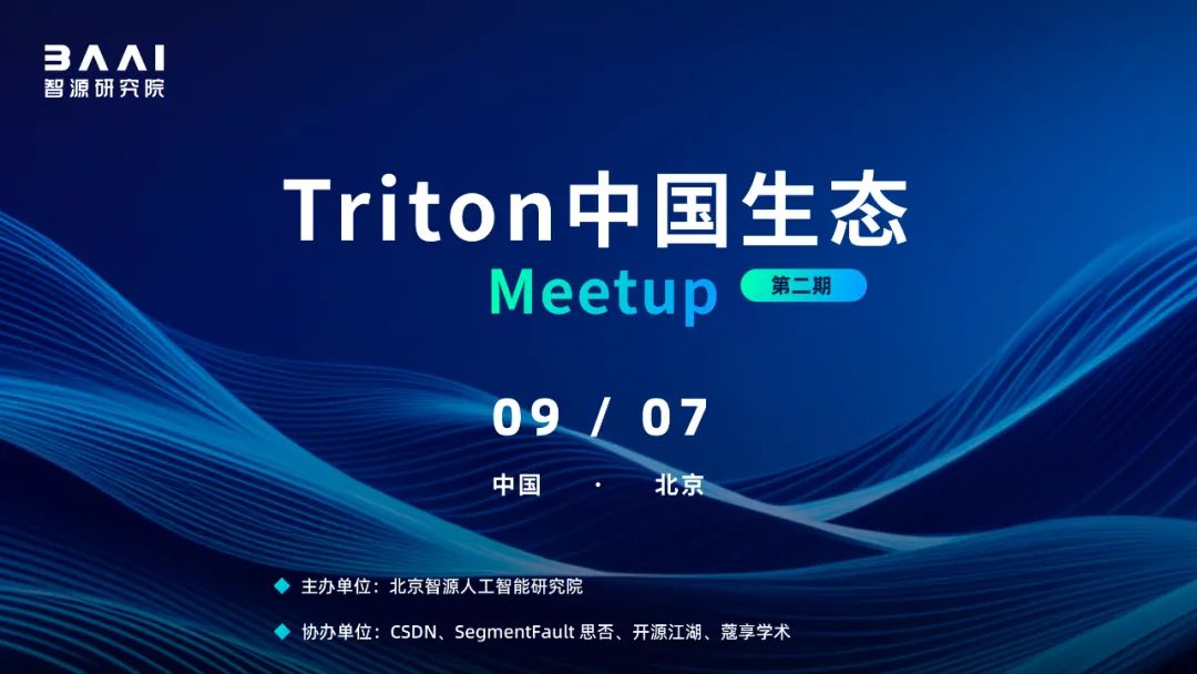 展望未来,智源研究院致力于打破壁垒,拓宽交流边界,携手国内外开发者及芯片厂商,共同推动Triton技术在中国的蓬勃发展,让 Triton 的先进成果惠及更广泛的人群。继今年 6 月 Triton 中国生态 Meetup 活动首次举办落地,第二期 Triton 中国生态 Meetup 也将于9月7日(周六)下午正式举办,旨在加速构建开放、协作的 Triton 生态体系,这不仅仅是一场活动的延续,更是 Triton 技术在中国加速落地、生态体系深化拓展的里程碑。
