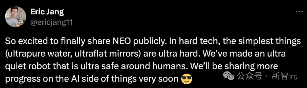 很高兴终于公开分享NEO。在硬核科技中,最简单的东西(超纯水、超平面镜)都是超级困难的。我们制造了一种超安静的机器人,在人类周围非常安全。我们很快就会分享人工智能方面的更多进展