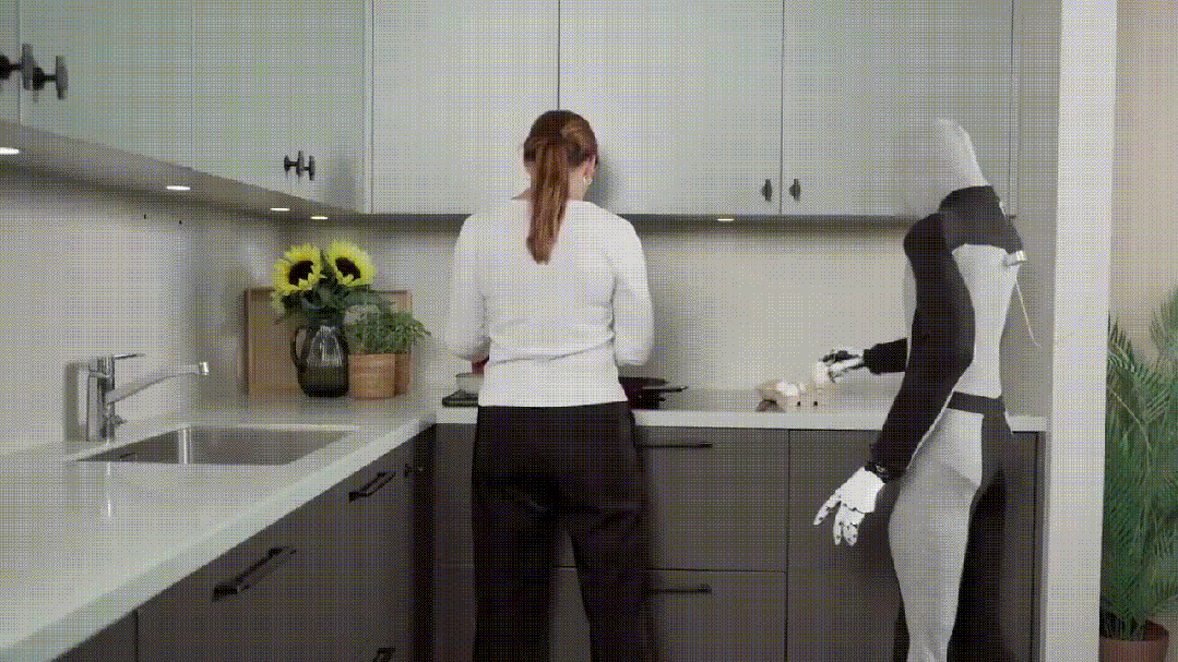 一段demo视频中,女主在厨房里正烹饪美食,NEO向她递过去鸡蛋。