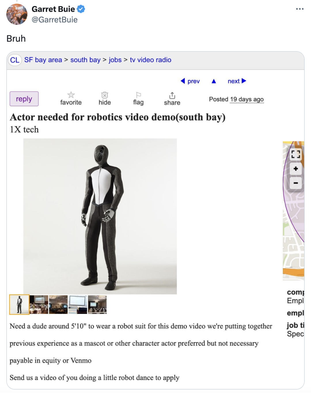 甚至还有人站出来“打假”,发布了一个“1X团队招募演员冒充机器人”的截图。