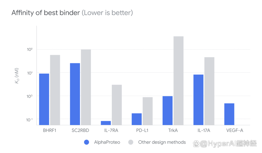 此外,研究人员还探索了在未经实验优化的情况下,与其他设计方法相比,AlphaProteo 设计的结合物对靶蛋白的最佳亲和力。结果发现,相比于现有最佳方法设计的结合物,AlphaProteo 生成结合物的结合亲和力更高,大约高出 3-300 倍。