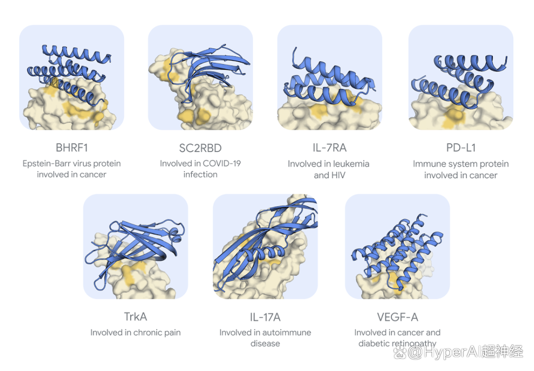 研究人员用 AlphaProteo 设计了 8 种不同结构靶蛋白的结合剂,并对它们进行实验测试。其中,有 2 种与感染有关的病毒蛋白 BHRF1 和 SARS-CoV-2 刺突蛋白受体结合域 SC2RBD,以及 5 种与癌症、炎症和自身免疫性疾病有关的蛋白 IL-7Rɑ、PD-L1、TrkA、IL-17A 和 VEGF-A,1 种与自身免疫性疾病如类风湿性关节炎相关的蛋白质 TNF。