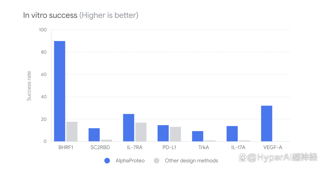 与其他设计方法相比,AlphaProteo 对 7 种靶蛋白的体外成功率
