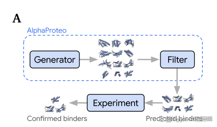 一个生成模型 (Generator) ,在蛋白质数据库 (PDB) 的结构和序列数据、以及 AlphaFold 预测结构的蒸馏集 (distillation set) 上进行训练,学习分子之间的结合方式;一个过滤器 (Filter),用于对生成的设计进行评分,以预测结合物是否能在实验中与靶蛋白成功结合。