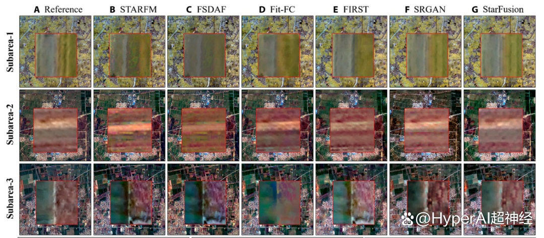 为了评估 StarFusion 的有效性,该研究基于 3 个子区域在 2 个不同日期拍摄的 Gaofen-1 和 Sentinel-2 图像,围绕预测图像生成的准确性和空间细节等因素,将 StarFusion 与其他代表性算法 (STARFM、FSDAF、Fit-FC、FIRST 和 SRGAN) 进行了比较。