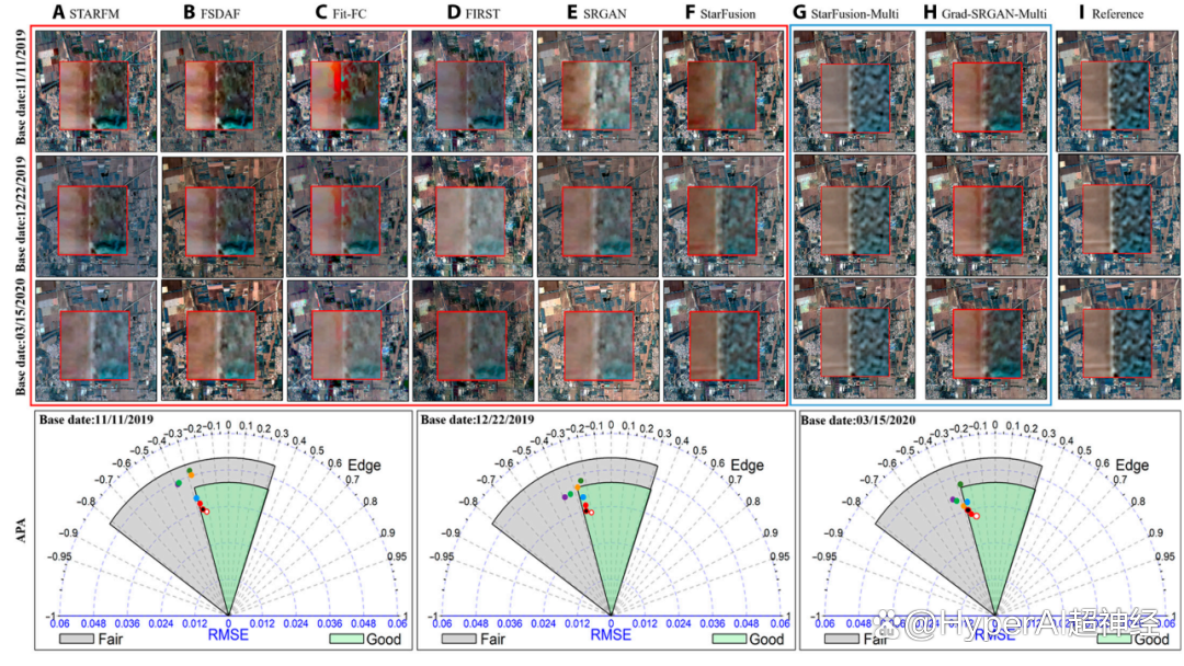 此外,StarFusion-Multi 和 Grad-SRGAN-Multi 在采用多对图像训练时,比单对图像训练有更佳表现,且 StarFusion-Multi 在 RMSE 和 Roberts 边缘方面持续超越 Grad-SRGAN-Multi。