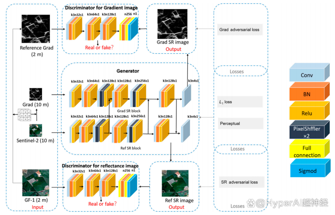 在偏最小二乘回归模型 (PLSR) 部分,该研究基于尺度不变假设 (Scale invariant),建立了具有更高自由度的多变量回归关系模型,进而更准确地预测时间变化。考虑到 Sentinel-2 相对于 Gaofen-1 图像的空间分辨率较低,该研究还设计了一种梯度图 SRGAN 模型 (Grad-SRGAN) 来处理粗糙图像到精细图像的降尺度任务。