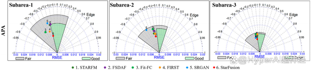 此外,如下的 APA 图还显示,StarFusion 方法具有强大的空间转移能力,没有显著的准确性或空间细节损失。值得注意的是,StarFusion 在视觉上处于「良好」范围的边缘,但没有落入该范围,这表明其性能在未来仍有改进的空间。