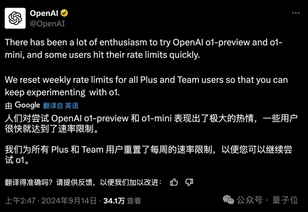 不过好消息是,就在今天凌晨,由于人们对o1实在太热情,导致很多人很快就把额度用完,所以OpenAI特例把额度重置了一次。