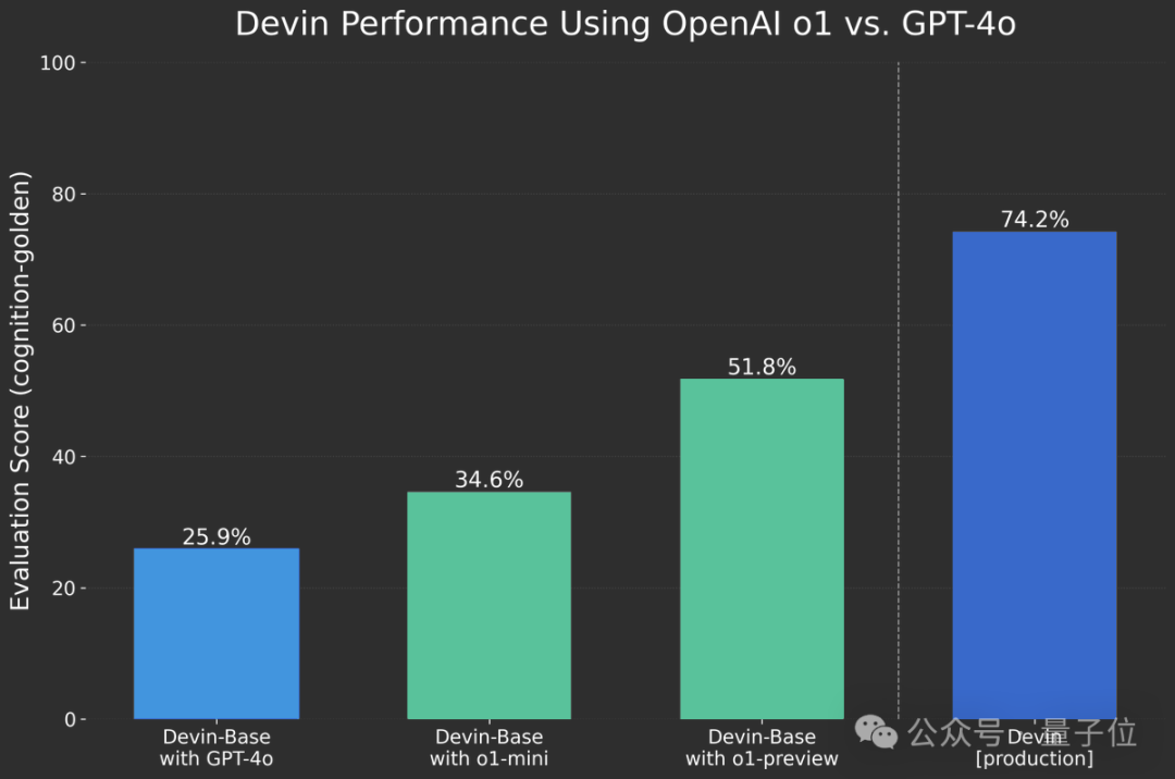 在他们的测试中,由o1系列驱动Devin基础版本,与GPT-4o相比获得非常大的提升。