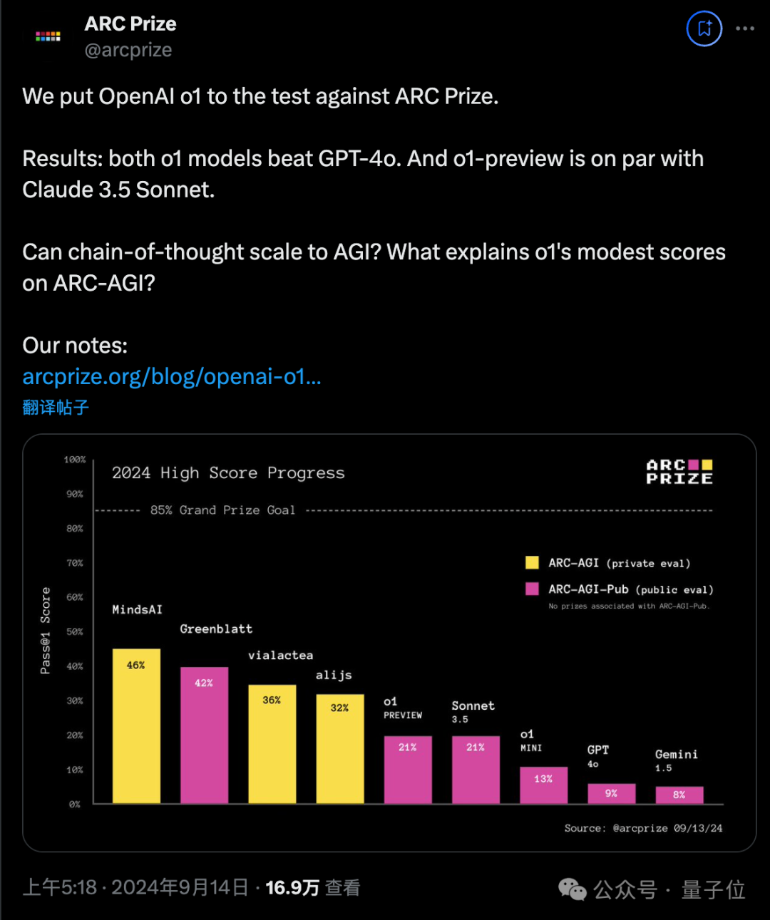在Keras之父举办的100万美金AGI Prize比赛中,o1-preview和o1-mini两个版本在公开测试集上都超过了自家GPT-4o。