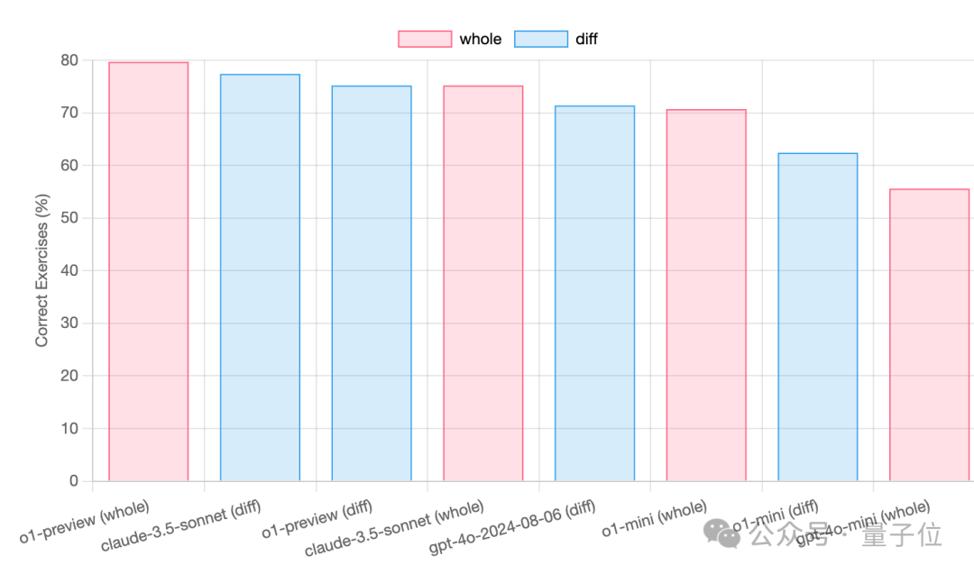 对于整个代码重写任务,o1-preiview取得79.7分,Claude-3.5-Sonnet取得75.2分,o1领先4.5分。