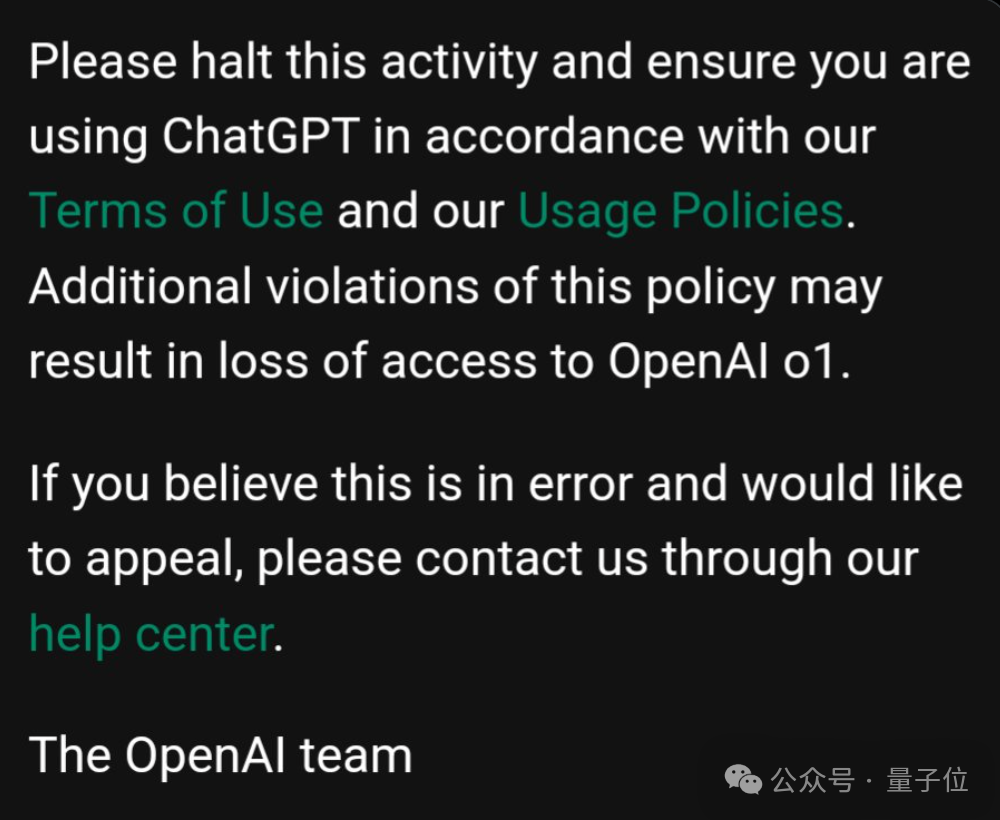 请停止此活动,确保您使用ChatGPT时符合我们的使用条款。违反此条款的行为可能导致失去OpenAI o1访问权限。