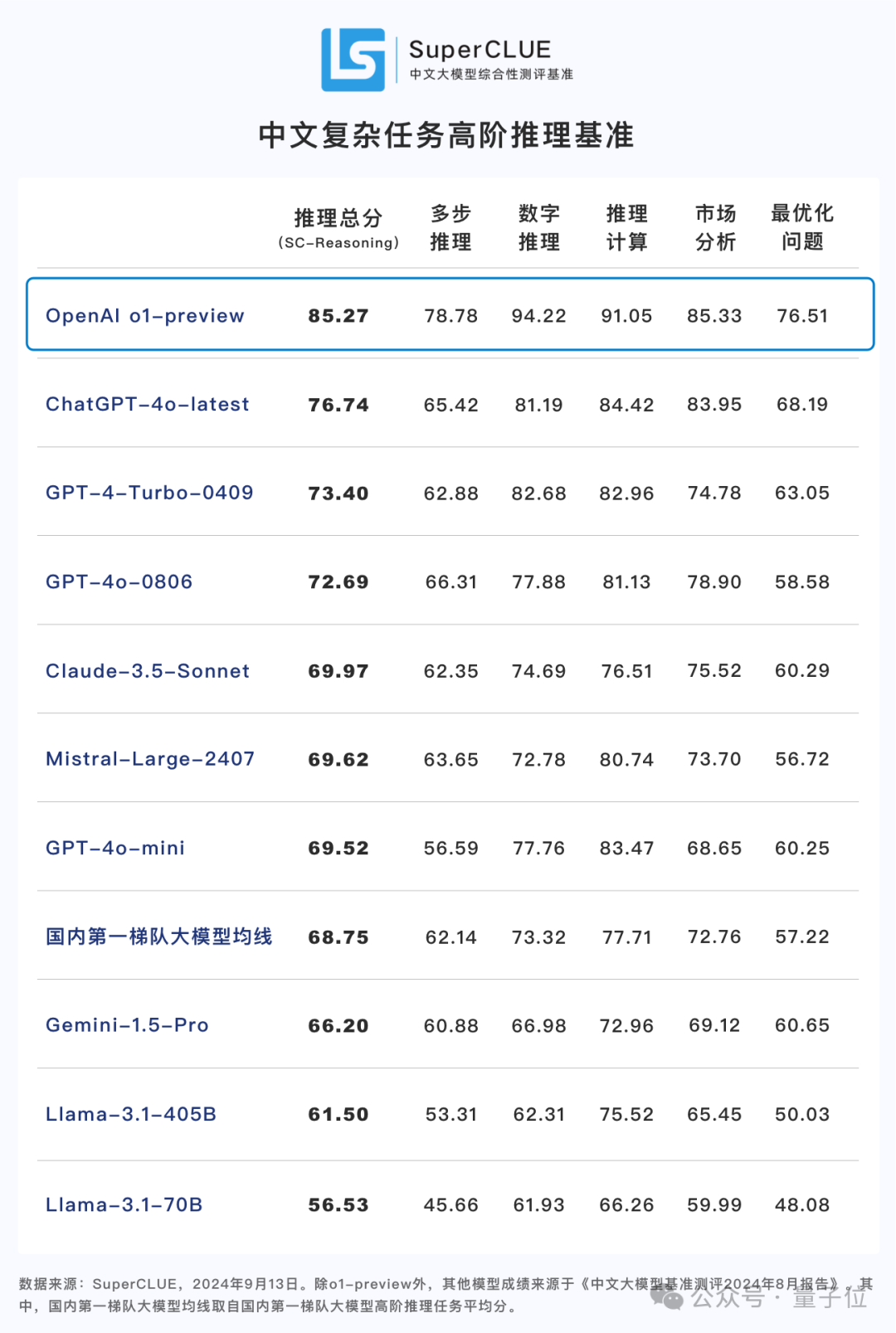 在中文大模型综合测评基准SuperCLUE的中文复杂任务高阶推理测试中,o1-preview的推理能力也大幅领先。