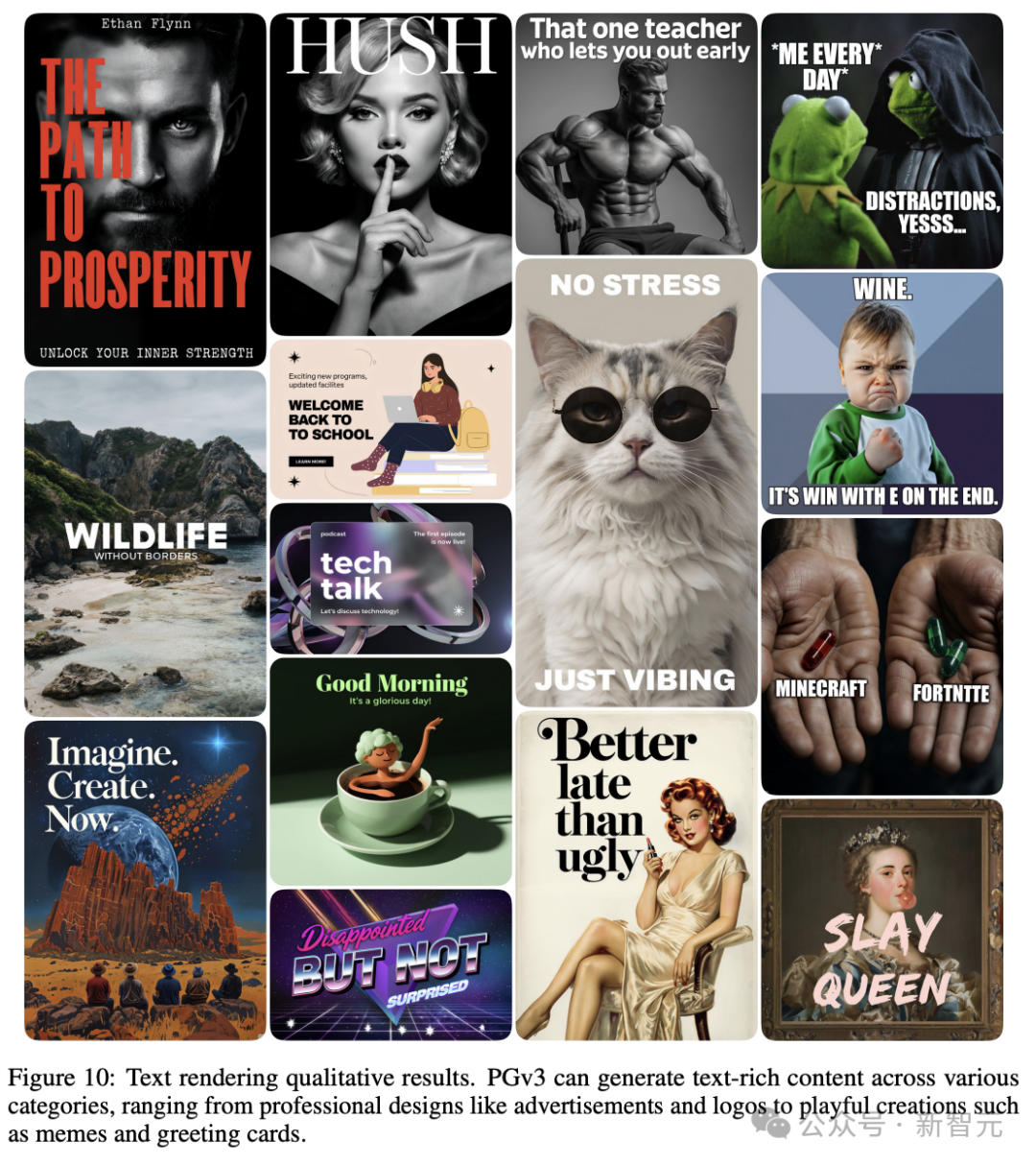 模型能够生成各种类别的图像,包括海报、logo、表情包、书籍封面和演示幻灯片,PGv3还能够复现带有定制文本的表情包,并凭借其强大的提示遵循和文本渲染能力,创造出具有无限角色和构图的全新表情包。
