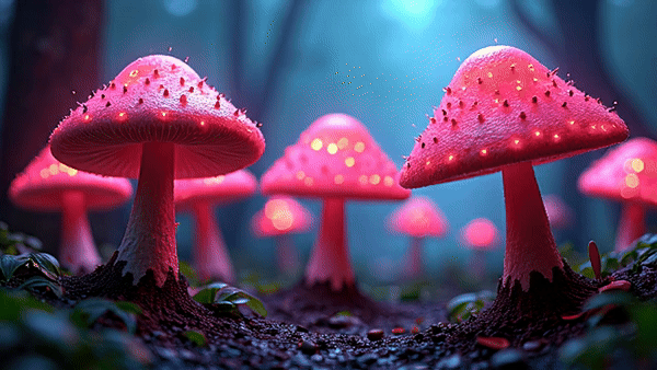 群“菇”乱舞,一群蘑菇在月光下尽情舞动,释放着自然的活力。