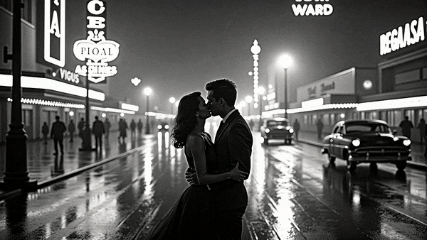1950年代的复古黑白电影,雨夜里车水马龙的街头,一对情侣雨中深情拥吻的瞬间……