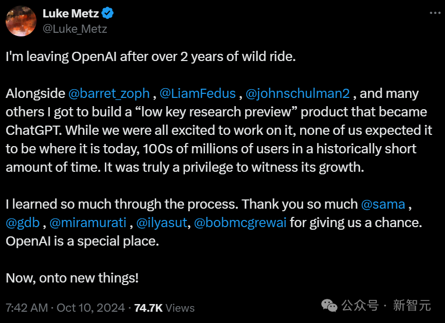 Luke Metz曾与Zoph和Fedus在谷歌AI研究组是同僚,如今在OpenAI任职两年后,也将离开这家公司。据称,Zoph、Fedus和Metz都是ChatGPT的主要贡献者,并在公司担任过各种后训练角色。目前,Zoph计划创办一家新公司,但尚不清楚Metz或Murati是否会加盟。在他官宣推文中,称自己是最初团队成员之一,并与联创John Schulman、后训练VP Barret Zoph、Liam Fedus以及其他许多同事一起,参与了一个「早期研究预览」产品的开发。虽然我们都对这个项目满怀热情,但没有人预料到它会在如此短的时间内取得如今的成就——拥有数亿用户。能够亲眼见证它的成长,真是一种难得的荣幸。