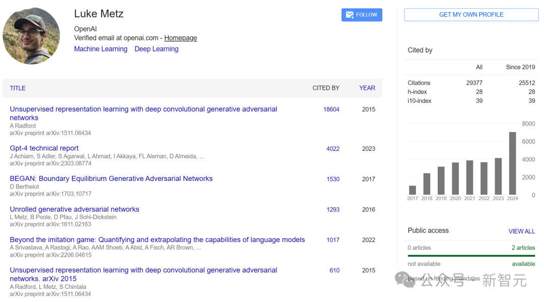 扒开ChatGPT发布之初的介绍页面,可以看到Luke Metz是其中的贡献者之一。他在个人主页介绍称,我是一个对将人工智能技术引入世界充满激情的研究者。在空闲时间,我喜欢研究机器人、编程语言、电子技术、3D打印和图形处理。在此之前,Luke曾是Google Brain的研究科学家。他在2015年获得了富兰克林·欧林工程学院的工程学士学位。在他Google Scholar所有研究中,被引次数最高的一篇论文,是本科毕业发表的关于CNN的无监督学习表示。https://www.theinformation.com/briefings/openai-names-new-head-of-post-training-while-another-researcher-departs?rc=epv9gi