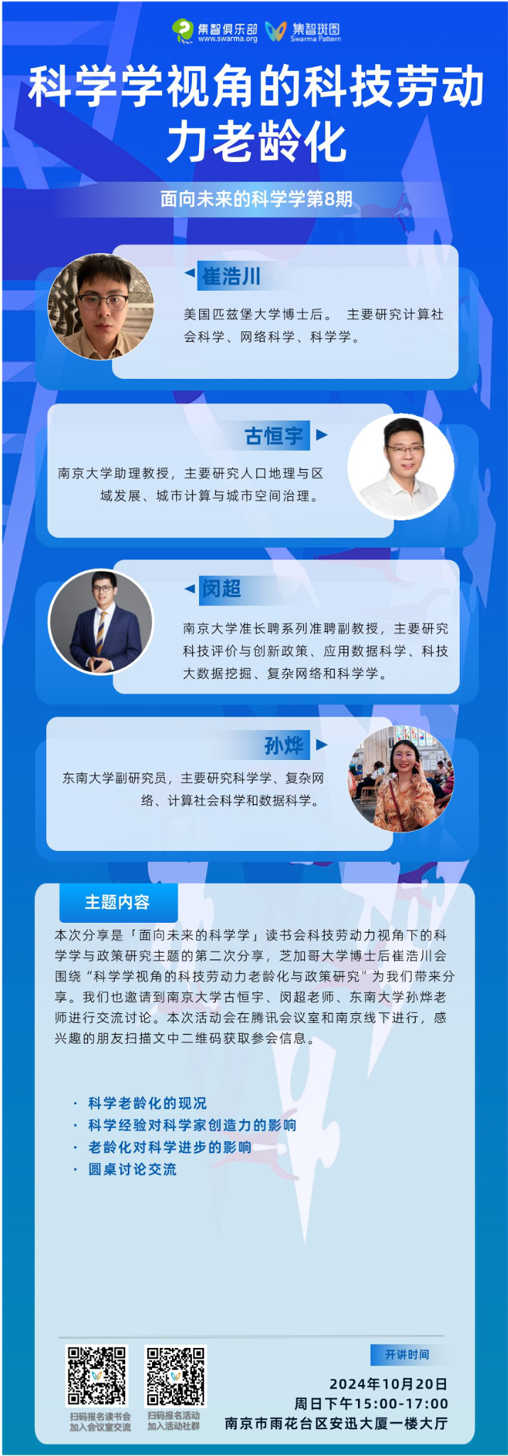 本次分享将于2024年10月20日下午三点在腾讯会议进行与南京线下同时进行。能够来线下的请扫码报名。扫码参与面向未来的科学学读书会,加入群聊,获取系列读书会回看权限,成为科学学社区的种子用户,与社区的一线科研工作者与企业实践者沟通交流,共同推动科学学社区的发展。