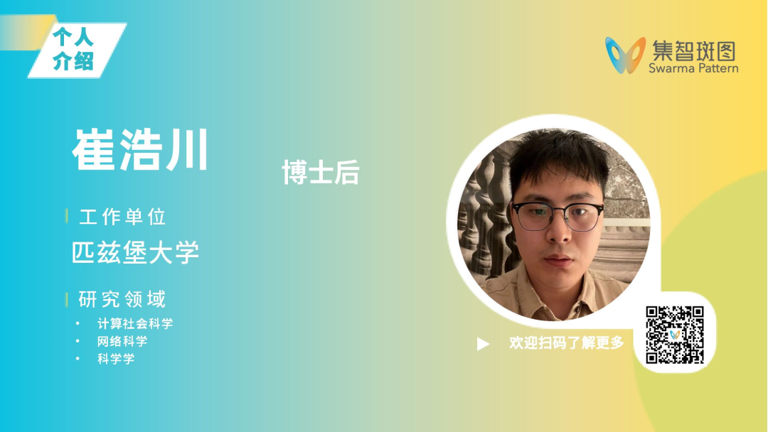 崔浩川,美国匹兹堡大学博士后。研究兴趣和方向:计算社会科学、网络科学、科学学。