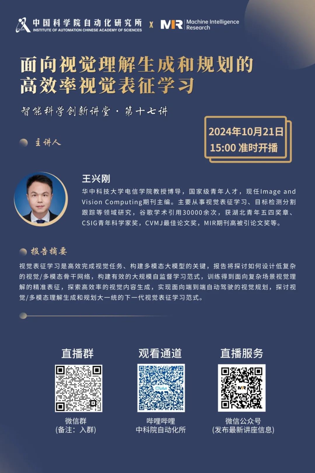 哔哩哔哩APP搜索"中科院自动化所”或扫描下方二维码,直播当天点击头像即可进入