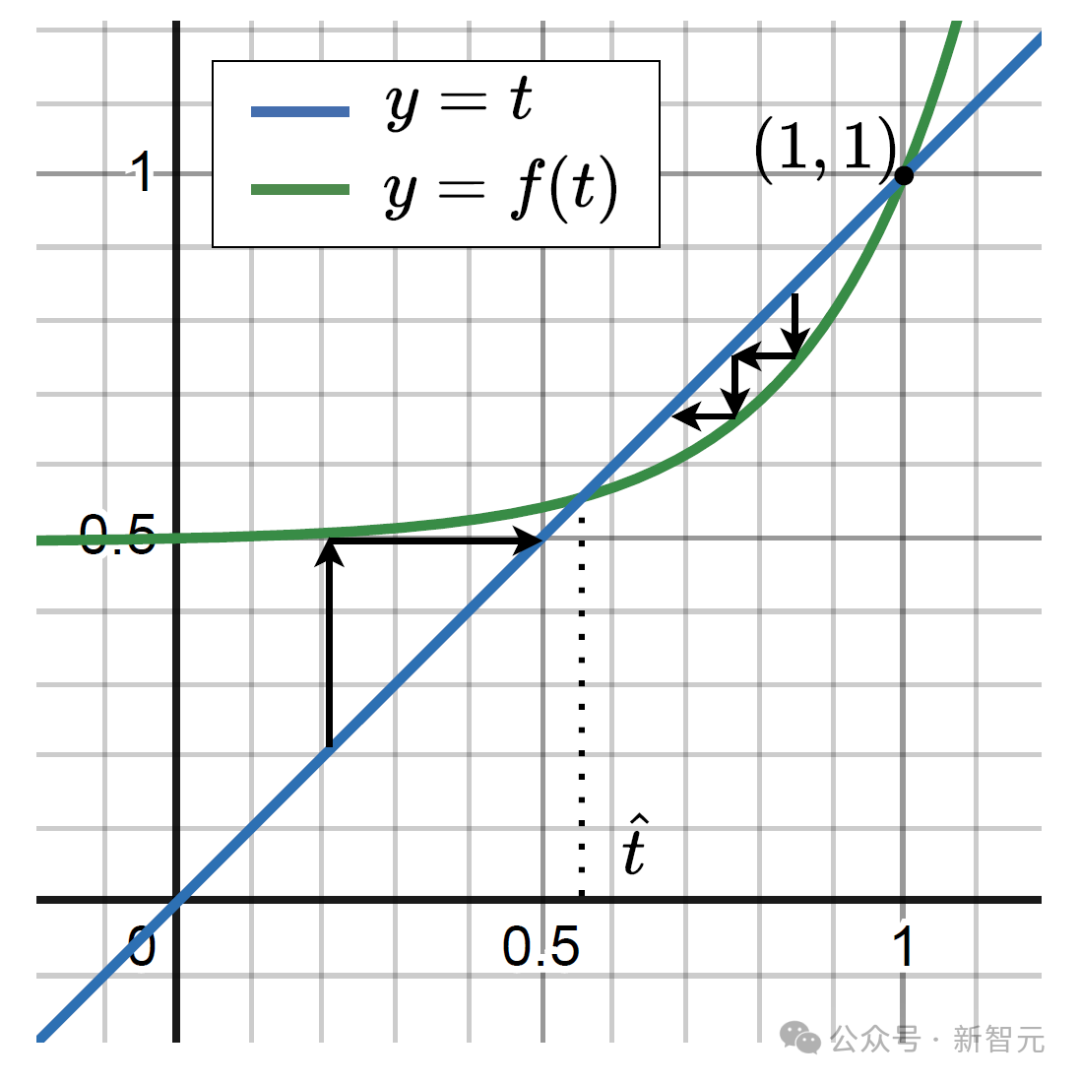 令 𝑔(𝑡)=𝑓(𝑡)−𝑡,表示第 𝑙 层的增长,可以考虑在 (0,1) 区间内存在一个点 𝑡^,使得 𝑔(𝑡^)=0。