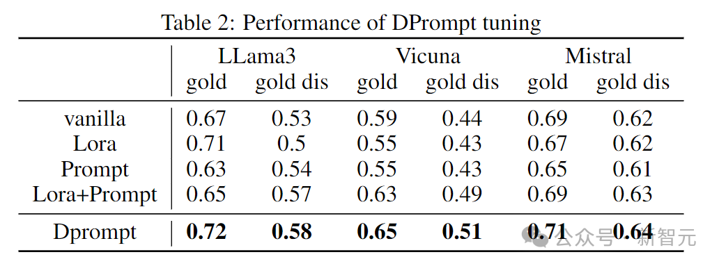 其中gold代表document中只包含一个文档,该文档直接包含了query的答案,但该文档中仍然存在一定的噪声;gold dis代表文档中包含gold文档以及distracting文档,distracting文档中包含错误的答案。由上图可见,DPrompt tuning有效提升了LLM在面对噪声时的性能。