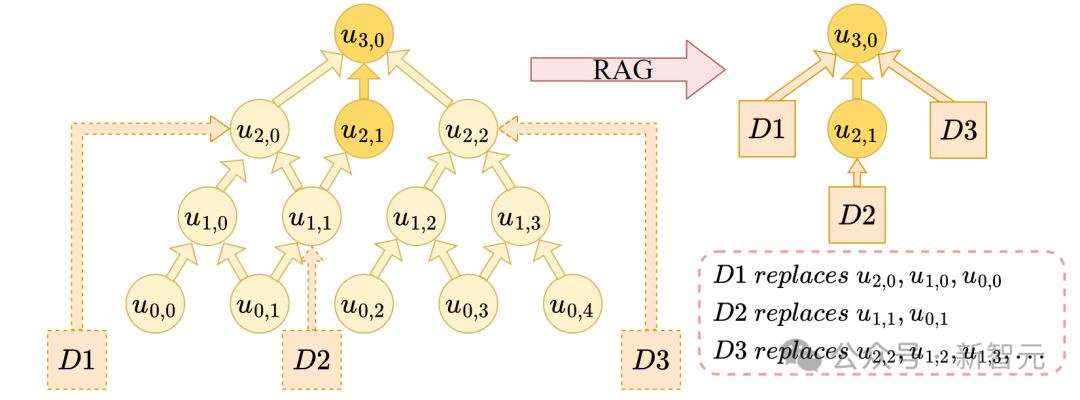 因此,如果某一层 𝑙′ 的所有节点都通过检索增强生成(RAG)方法被简化,任何 𝑙≤𝑙′ 的层都可以被消除,从而有效降低整体的推理深度。