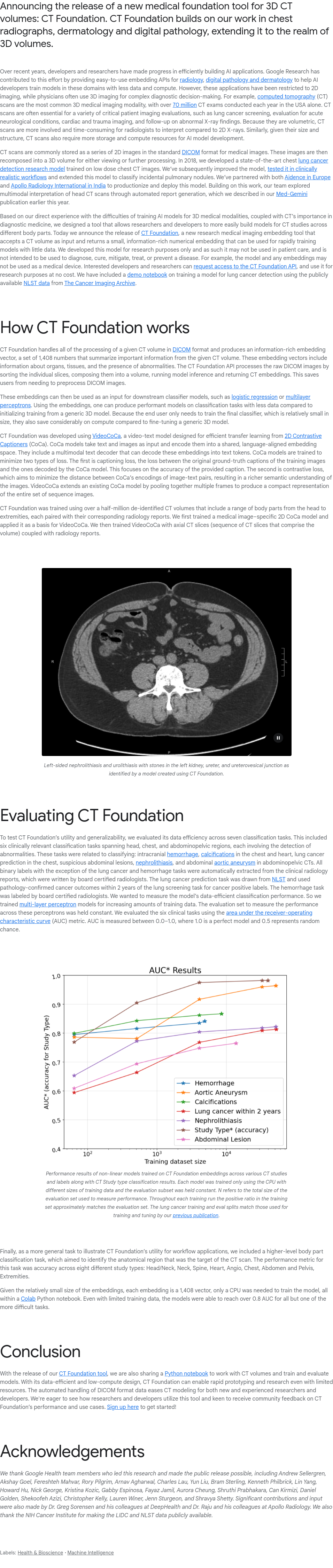Google Research宣布推出新的3D CT体积医学基础工具——CT Foundation。该工具在胸部X光、皮肤病学和数字病理学工作的基础上,扩展到3D成像领域。近年来,开发者和研究人员在高效构建AI应用方面取得进展,Google Research通过提供易于使用的嵌入式API,帮助AI开发者在放射学、数字病理学和皮肤病学等领域以更少的数据和计算资源训练模型。然而,这些应用主要局限于2D成像,而医生在复杂诊断决策中常使用3D成像。例如,CT扫描是最常见的3D医学成像方式之一,每年在美国进行超过7000万次CT检查,对肺部癌症筛查、急性神经疾病评估等关键患者成像评价至关重要。CT Foundation旨在填补这一空白,推动3D医学影像AI应用的发展。