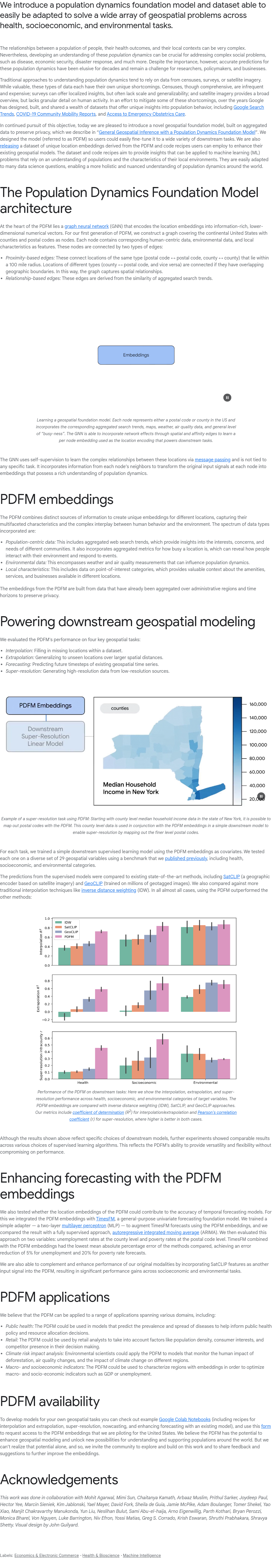 本文介绍了一种人口动态基础模型和数据集,能够轻松适应解决广泛地理空间问题,涵盖健康、社会经济和环境任务。人口与其健康结果及当地环境之间的关系非常复杂,理解这些动态对于应对疾病、经济安全、灾害响应等社会问题至关重要。然而,尽管重要性显著,但准确预测人口动态数十年来一直难以实现,对研究人员、政策制定者和企业构成挑战。传统方法通常依赖于普查、调查或卫星图像数据,虽然有价值,但各有局限:普查虽全面但频率低且成本高;调查可提供局部见解,但代表性有限。