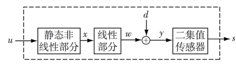 对如图3所示的具集值输出以及多项式形式静态非线性的Hammerstein 系统[6],在不要求非线性部分单调的前提下,针对系统的结构特点,提出比例强满秩信号的概念,构造了辨识算法,分析了算法的最优性。在二集值输出观测的前提下,辨识 Hammerstein系统比辨识Wiener 系统还要难,这是因为Hammerstein系统与二集值传感器这种非线性元件结合之后,非线性同时存在于输出端和输入端,这为系统辨识带来了一定的难度。为了研究二集值输出的Hammerstein系统辨识,就需要探索新的思路和方法。考虑图3中的Hammerstein 系统,团队重点研了Hammerstein 系统具有多项式形式的非线性部分,且系统的输出被二集值传感器测量。用强满秩周期输入,可以有效克服两端非线性给辨识带来的困难。