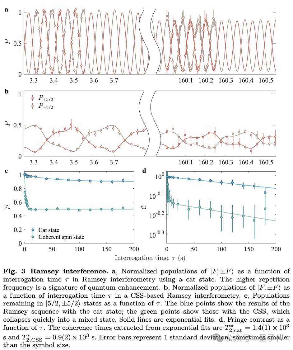 这使得猫态实现了1.4(1)×10³秒的超长相干时间,即约23分钟,远超常规相干自旋态(CSS)在相同条件下实现的0.9(2)×10³秒相干时间。