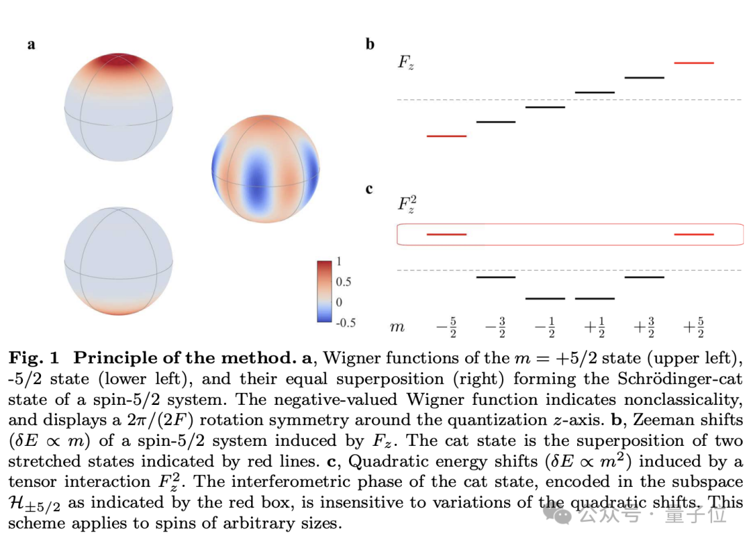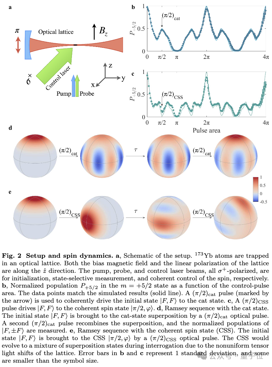 这一系列精确操作成功制备出了¹⁷³Yb原子的薛定谔猫态,该状态是具有自旋量子数5/2的原子核自旋投影态m=+5/2和m=−5/2的量子叠加。