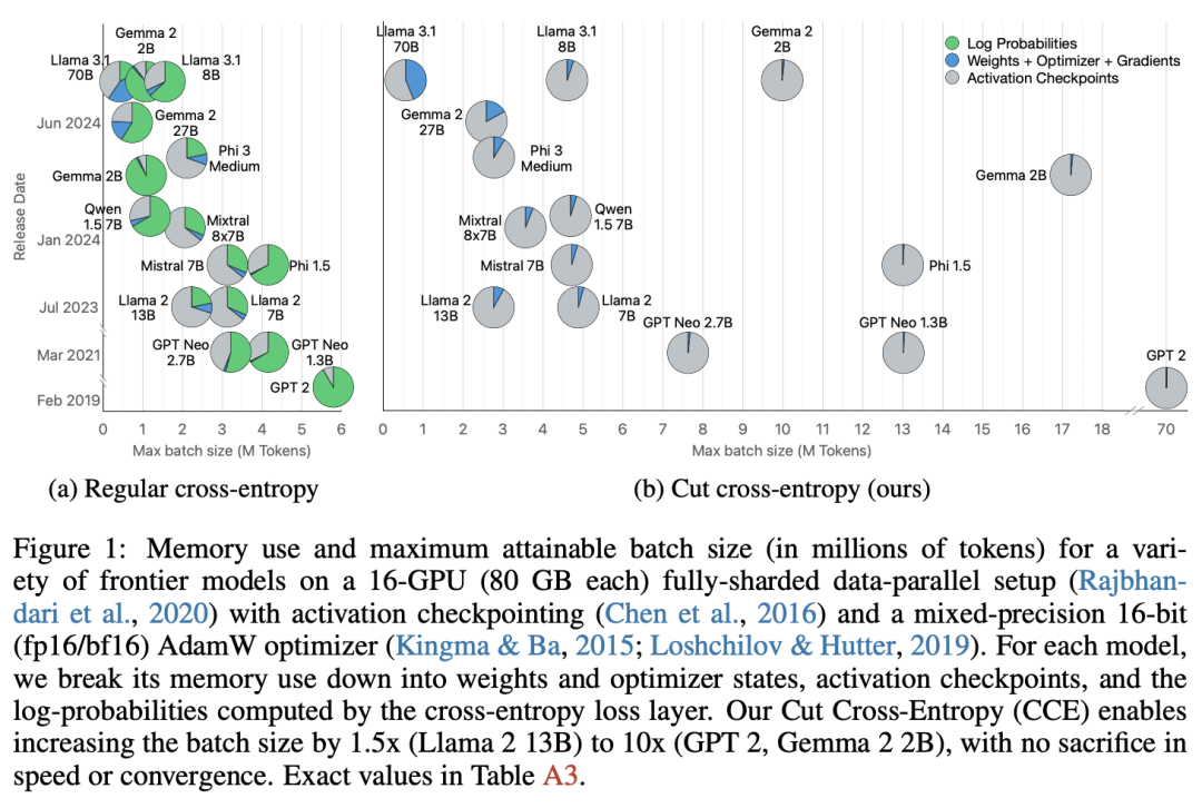 在这项工作中,苹果团队提出的切分交叉熵(CCE)是一种计算交叉熵损失的方法,无需将所有 token 的对数具体化到全局内存中。相反,CCE 只计算正确 token 的对数,并对所有对数的 log-sum-exp 进行快速评估。他们实施了一个自定义内核,在闪存中对词汇进行矩阵乘法和 log-sum-exp 缩减,使得交叉熵计算的全局内存消耗可以忽略不计。这将产生显著效果。
