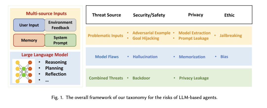 为了帮助研究人员全面了解各种风险,来自浙江大学的研究团队及其合作者收集并分析了这些智能体所面临的不同威胁。为了应对以往分类法在处理跨模块和跨阶段威胁方面的挑战,他们提出了一种基于来源和影响的新型分类框架。此外,他们还确定了基于 LLM 的智能体的六个关键特征,并在此基础上总结了当前的研究进展,分析了其局限性。随后,他们选择了四个具有代表性的智能体作为案例,分析它们在实际使用中可能面临的风险。最后,基于上述分析,他们分别从数据、方法和政策的角度提出了未来的研究方向。