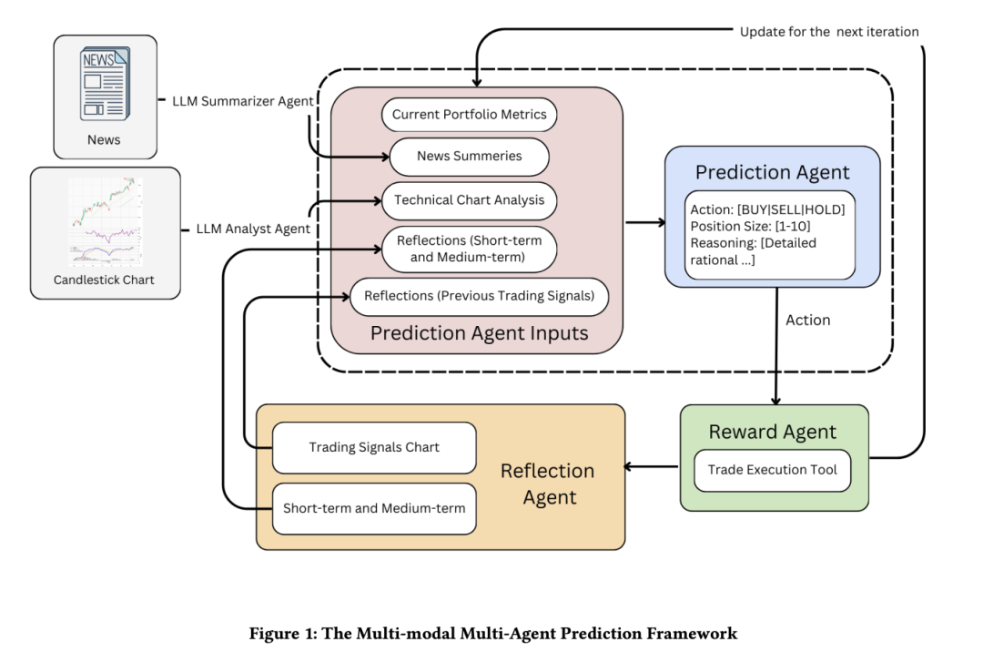 在这项工作中,来自伊利诺伊大学芝加哥分校的研究团队提出了一种专为金融交易任务设计的多模态多智能体系统。他们的框架采用了一个基于 LLM 的专业智能体团队,每个智能体都擅长处理和解释各种形式的金融数据,如文本新闻报道、蜡烛图(K 线图)和交易信号图。该方法的一个主要特点是集成了反思模块,对历史交易信号及其结果进行分析。这一反思过程有助于增强系统对未来交易情景的决策能力。此外,消融研究表明,视觉反射模块在增强该框架的决策能力方面发挥着至关重要的作用。