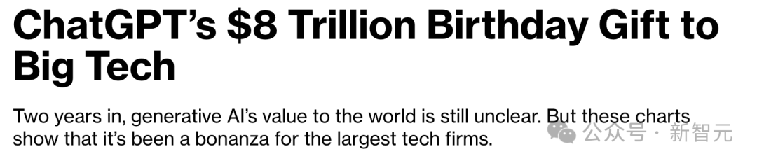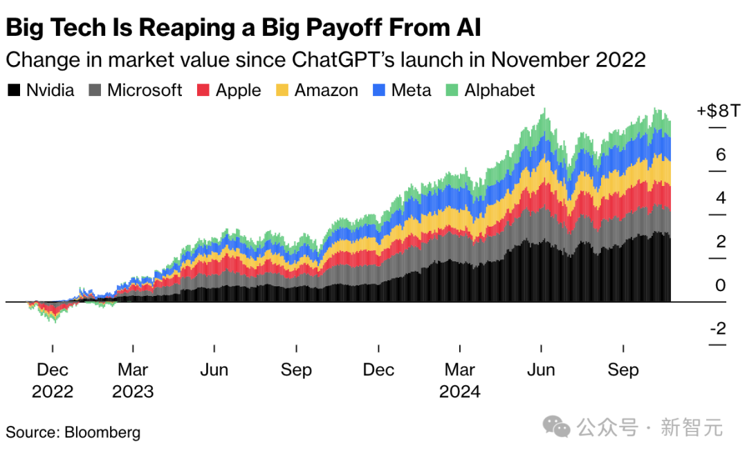 彭博最新统计称,包括英伟达、谷歌、微软、苹果、亚马逊在内的科技巨头,在这场AI红利中,共享了8万亿美金的估值。