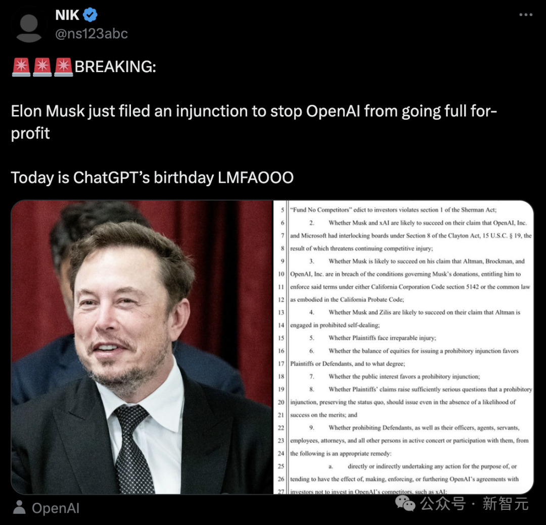 他向法院提交了一项最新禁令,目的是为了阻止OpenAI全面盈利。