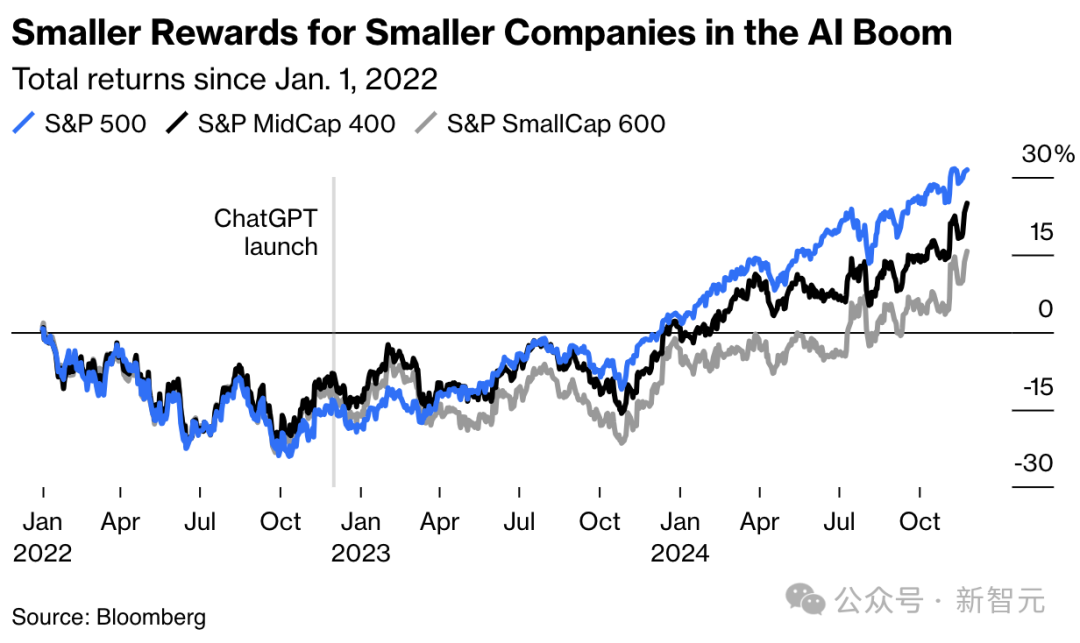 开局一张图,简单绘制了ChatGPT自2022年推出以来,六家公司的市值变化,整个科技板块S&P 500指数上涨了30%。