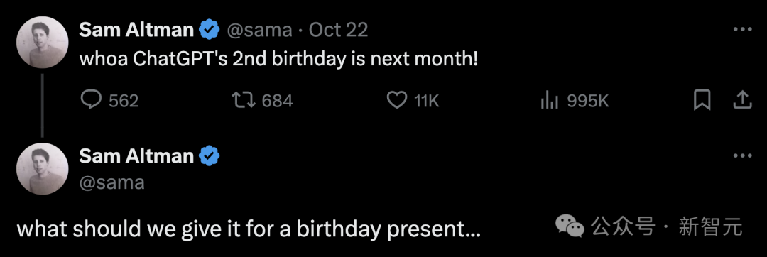 一个多月前,奥特曼曾表示,「下个月是ChatGPT的第二个生日,我们应该送它什么生日礼物呢」?