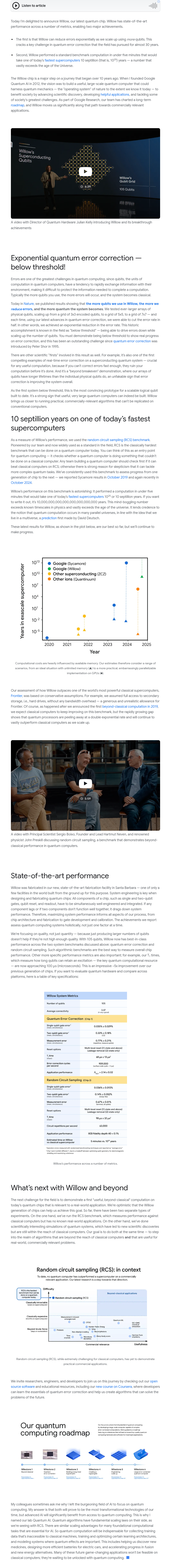 今日宣布推出最新的量子芯片Willow,该芯片在多个指标上展现出顶尖性能,实现了两大重要突破。首先,Willow能够随着量子比特数量的增加而指数级减少错误,解决了量子纠错领域近30年来的一大难题。其次,Willow在不到5分钟内完成了一项标准基准计算,而这项任务即使使用当今最快的超级计算机也需要10的25次方年才能完成,这个时间远远超过了宇宙的年龄。Willow芯片是自2012年Google Quantum AI成立以来,历经10多年努力的重大进展,旨在构建能够利用量子力学为社会带来利益的大型量子计算机,推动科学发现、开发有益应用并解决社会面临的重大挑战。